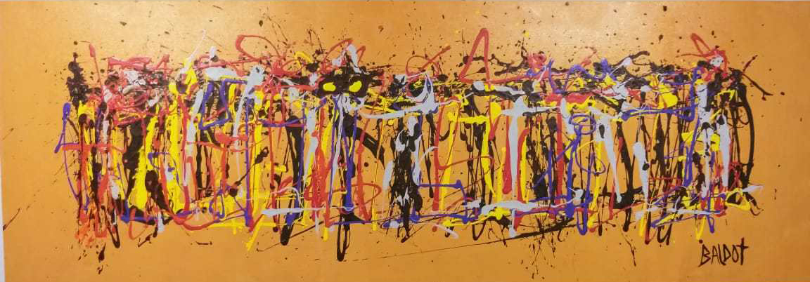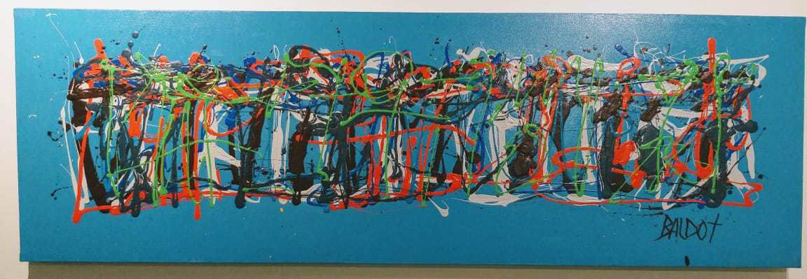 Recordemos que, para hacer sus creaciones, Baldot utiliza guantes de boxeo. El artista denominó esta técnica como ‘Acción pintada’, debido a que no emplea los tradicionales pinceles, en su lugar utiliza guantes untados de acrílicos, mezclando movimientos rápidos para plasmar figuras abstractas sobre un lienzo.