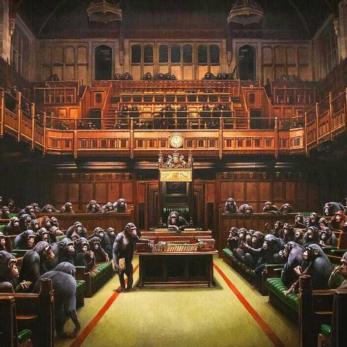 El Parlamento descentralizado de Banksy, con las Cámaras del Parlamento llenas de chimpancés, se vendió por 9,9 millones de euros el año pasado. Un gran hito del arte en el siglo XXI