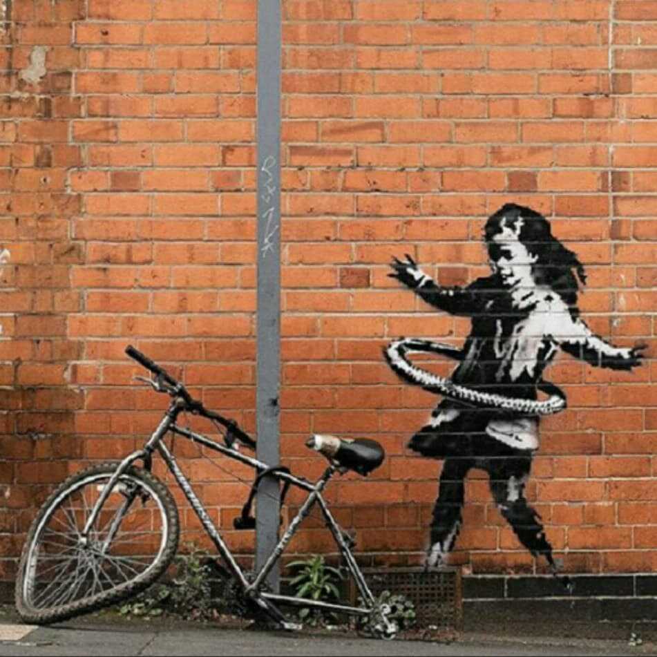 Banksy ha publicado una foto en Instagram, poniendo fin a la especulación. La pieza apareció en una pared el martes, justo detrás de la bicicleta maltratada y sin un neumático, que la chica está usando como aro.