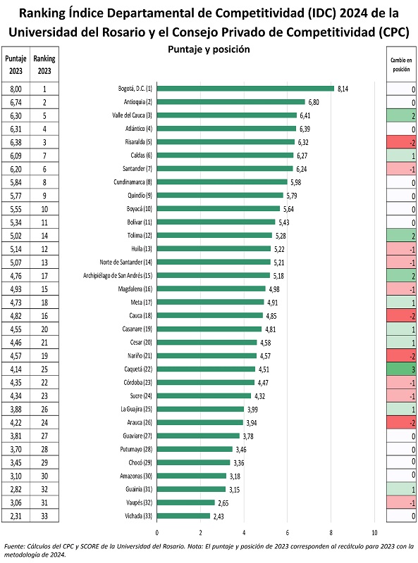 Para conocer el detalle de la metodología y los resultados del IDC 2024 puede consultar la página https://idc.compite.com.co/. Así mismo, los interesados en ampliar la información de la clasificación pueden contactar a Fabián Bernal, coordinador de los índices subnacionales de competitividad en el Consejo Privado de Competitividad (fbernal@compite.com.co) y a Daniel Torralba, coordinador del Centro de Estudios para la Competitividad Regional-SCORE de la Universidad del Rosario (daniel.torralba@urosario.edu.co).