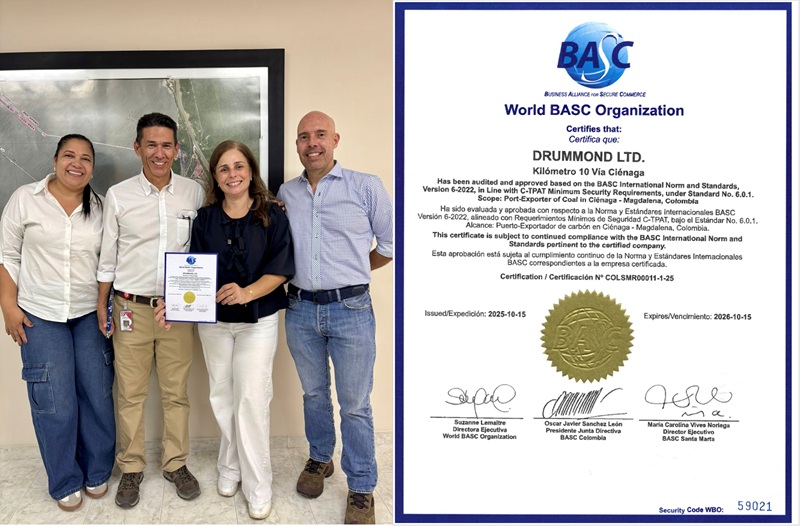 Drummond Ltd. reafirma su compromiso con la seguridad en sus operaciones portuarias con la recertificación BASC