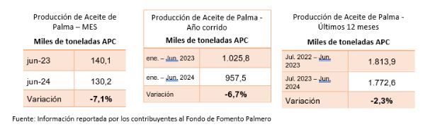 En junio, la producción de aceite de palma fue de aproximadamente 130 mil toneladas, es decir, 10 mil toneladas menos que en junio de 2023. El fenómeno del Niño ha impactado el cultivo de palma de aceite, lo que ha resultado en una menor dinámica de producción. De hecho, durante el primer semestre del año, la producción disminuyó un 6,7% respecto al mismo periodo 2023. Sin embargo, la zona suroccidental ha mantenido niveles de producción superiores a los registrados en el 2023.