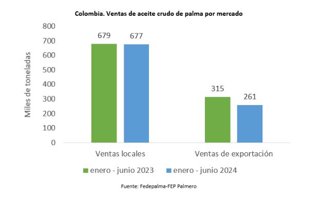 Durante el primer semestre de 2024, las ventas de aceite de palma alcanzaron las 938 mil toneladas. Del total, el 72% se vendió en el mercado local y el 28% restante se destinó al mercado de exportación. Esto se debe a la buena competitividad de esta materia prima en el país, tanto para usos comestibles y no comestibles. En el mercado local, los principales segmentos de destino del aceite de palma son los aceites y grasas comestibles (49%) y biodiesel (43%). En cuanto a las ventas de exportación, el 75% se dirigió principalmente a los mercados de México, Brasil y República Dominicana.