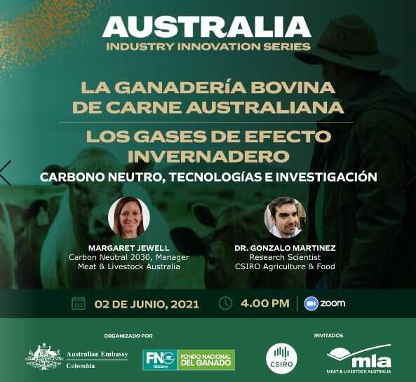El evento virtual, que hace parte del intercambio de conocimiento, es un proyecto liderado por la Embajada de Australia, que tendrá como invitados a Margaret Jewell, gerente de Carbón Neutral 2030 – Meat & Livestock Australia (MLA), científica agrícola con doctorado en genética vegetal y Gonzalo Martínez, científico investigador de la Organización en Investigación Científica e Industrial del Commonwealth (CSIRO), con doctorado en el estudio del efecto de los aditivos. (Link de inscripción al webinar)