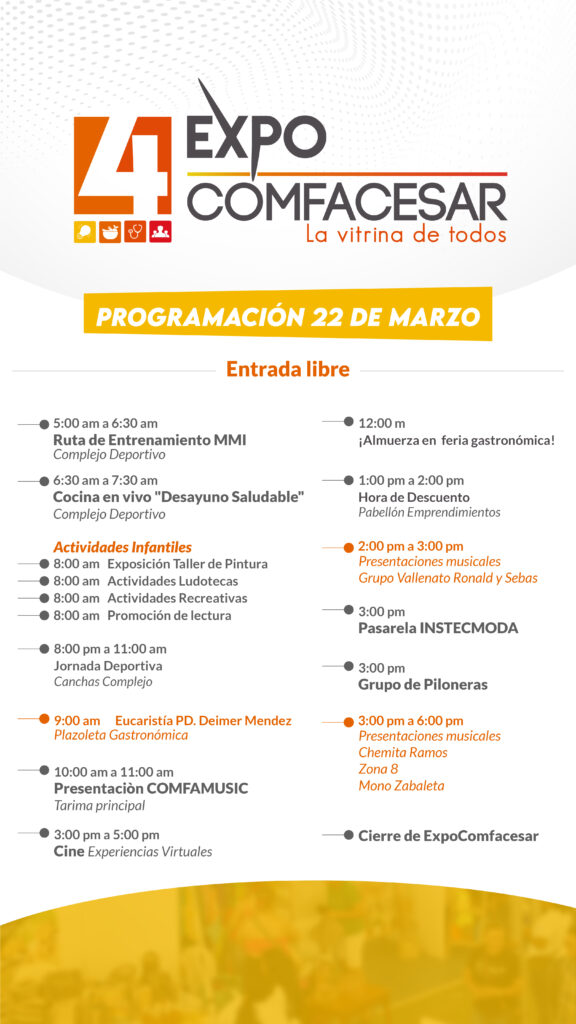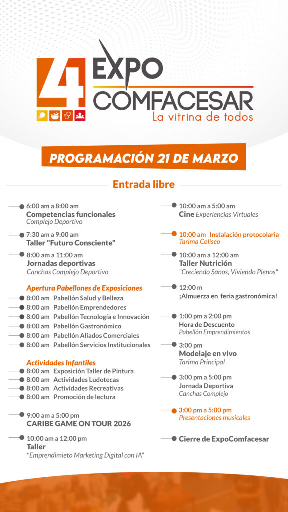 El Torneo Caribe Game On Tour, que tendrá eliminatorias el sábado 21, la ruta de entrenamiento de la Media Maratón de la Independencia, ofertas en suplementos nutricionales a través de IPS Comfacesar y prestadores de salud, además de espectáculos musicales, son algunos de los atractivos de esta macroferia, que, como es habitual, contará con pabellones de emprendimiento, tecnología, salud y belleza. Asimismo, habrá actividades recreativas y deportivas, entretenimiento para niños y niñas, conferencias y mucho más para toda la familia.