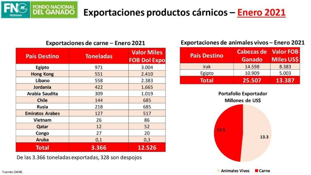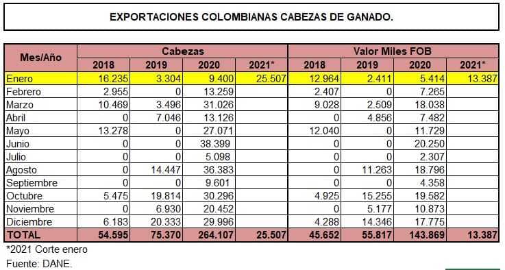Las ventas internacionales de carne, despojos y animales vivos de origen Colombia, durante enero de este año, fueron las más elevadas de los últimos cuatro años tanto en toneladas y cabezas como en valor. En el primer caso totalizaron 3366 toneladas (de ellas, 328 t de despojos) por USD 12,5 millones y 25.507 animales en pie por USD 13,3 millones.