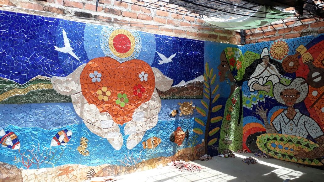¿Pero en qué consiste este emprendimiento llamado “Patio Taller Macondo”? PTM nace un mes de mayo de 2017, luego de que sus gestoras, Lourdes V. Narváez M. y Yarime Lobo Baute, realizaran por primera vez un trabajo en la técnica de Trencadís en la fachada del Colegio Fisher Kids sede campestre, en la vía que conduce al corregimiento de Río Seco. La arquitecta y artista Yarime Lobo atendiendo la invitación que le extendiera la fundadora y directora de este plantel educativo, asumió el reto de interpretar el anhelo de esta visionaria mujer llamada Gloria Oliveros y se dio a la tarea de realizar los diseños y ejecución de esta obra de más de 80 metros cuadrados, a la cual dio participación a jóvenes de la talla de artistas como Diego Rueda, Yull Nuñez, entre otros y mujeres como las artistas Orieta Fajardo y Lourdes Narvaéz, siendo esta ultima la más entusiasta que una vez finalizado el trabajo en el Colegio quiso replicar en el patio de su hogar la técnica aprendida en la obra del Colegio que consiste en la instalación de pequeños trozos de baldosas, adheridas a la pared con una masilla y recubierta con pasta de colores, configurando obras de colorido, belleza y durabilidad en el tiempo. Fue así que la arquitecta Yarime Lobo motivada por la visión donó varios diseños al patio de esta vivienda que colinda con el Coliseo Cubierto y se encuentra enclavada en el barrio Garupal, aportó materiales como baldosas de todos los colores, pegantes, mallas y todo lo que se requiere para la realización de una obra de este tipo, además de facilitar herramientas para llevar a cabo este laboratorio artístico y de formación que apunta a llegarle a todo aquel que desee aprender las técnicas de mosaico y trencadís.
