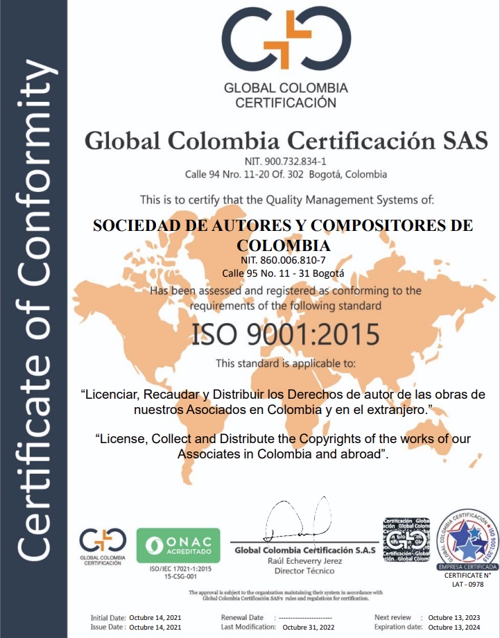 Una vez más, la Sociedad de Autores y Compositores de Colombia, SAYCO, es reconocida como una organización que cumple con los altos estándares de calidad que exige el mercado, en esta ocasión al recibir por segundo año consecutivo el Certificado de Calidad, de la empresa Global Colombia Certificación basados en la Norma ISO 9001:2015; un logro que es el resultado de dar cumplimiento a la misión de SAYCO que consiste en licenciar, recaudar y distribuir los derechos de autor de las obras de nuestros asociados en Colombia y el extranjero. Esta certificación se logró luego de la acuciosa evaluación desarrollada a las áreas de Recaudo, Distribución, Planeación, Calidad y Gestión Humana.