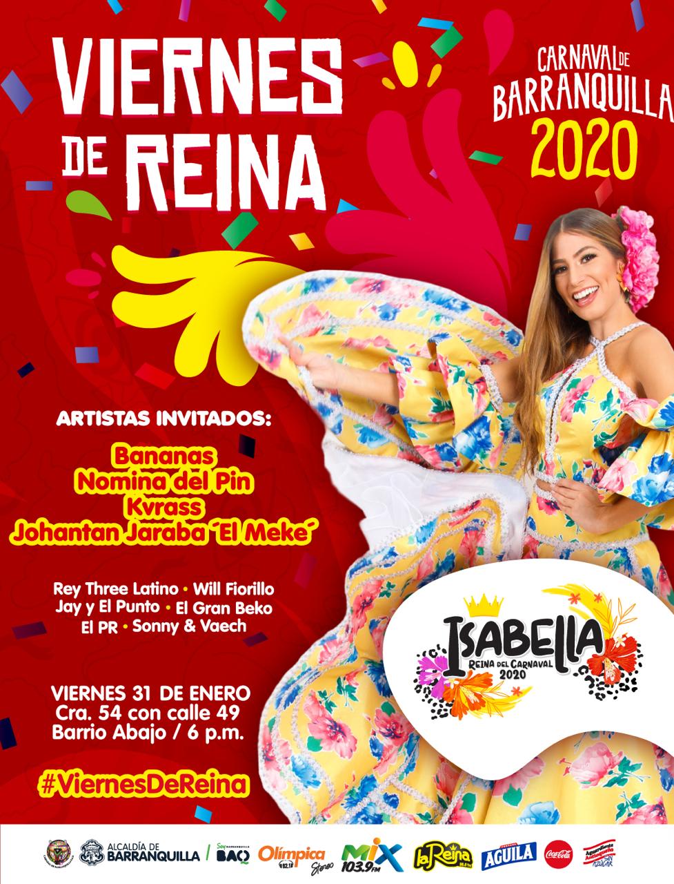 ¡#ViernesDeReina en Barrio Abajo!?? Gózate el viernes carnavalero con la Reina @Isabellachams este 31 de enero desde las 6 de la tarde, una fiesta pa que la cante y la baile la gente con las Reinas Populares 2020 y los invitados especiales. #QuienLoViveEsQuienLoGoza ???? pic.twitter.com/8JzTik7cKm